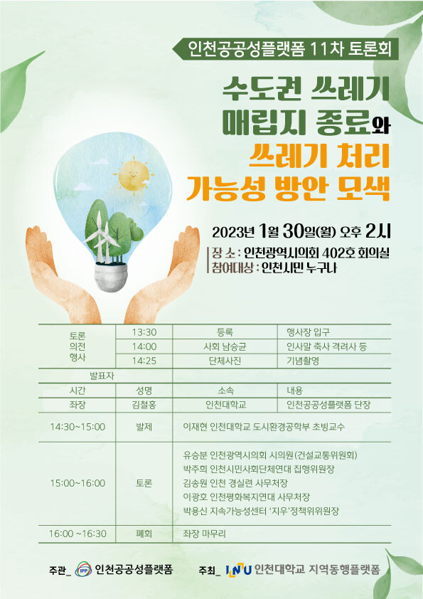 이번 토론회는 인천지역의 주요 이슈인 수도권매립지 종료와 대체부지 논의의 과정과 관련된 내용을 다룬다. 남승균 박사의 사회로 인천대 공공성플랫폼 김철홍 단장이 좌장을 맡아 진행될 예정이다.
