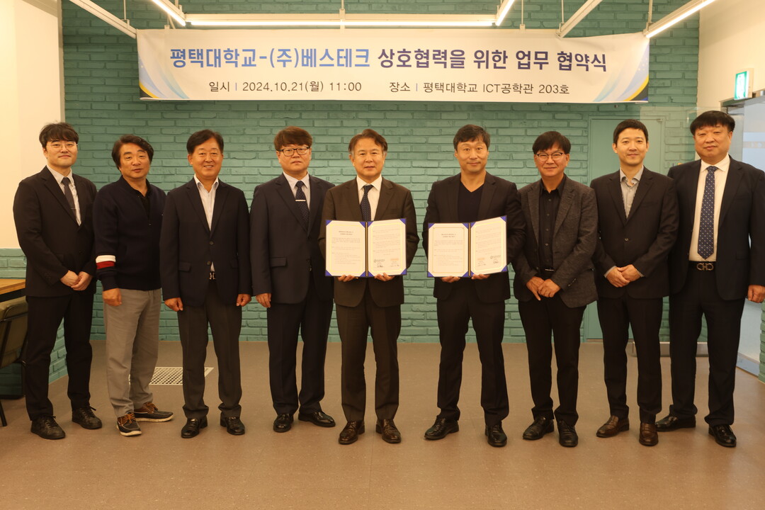 이동현 총장(왼쪽 다섯번째), 원기정 대표(왼쪽 여섯번째)를 비롯한 평택대 및 베스테크 관계자들이 업무협약식을 마치고 기념촬영을 하고 있다. 사진=평택대 제공 |
