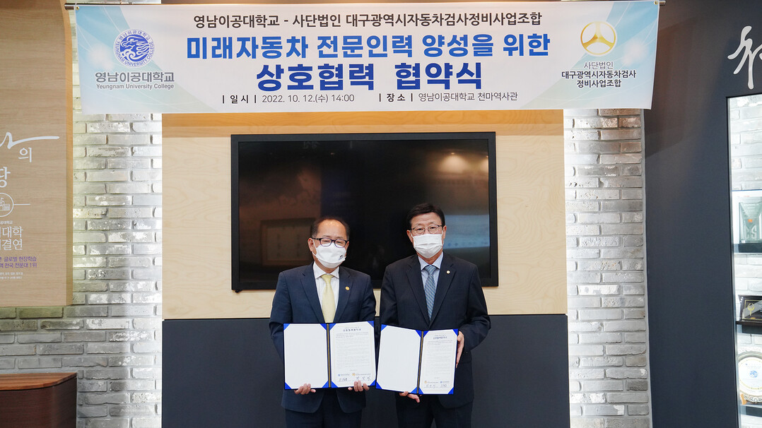 [대학저널 오혜민 기자]영남이공대학교는 지난 12일 천마스퀘어 역사관에서 대구시자동차검사정비사업조합과 미래자동차 전문인력 양성을 위한 협약을 체결했다고 13일 밝혔다.