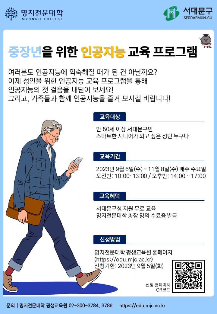 ‘중장년을 위한 인공지능 교육 프로그램’은 서울 서대문구 지원을 받아 명지전문대학이 운영하는 대학연계 평생교육 프로그램이다.