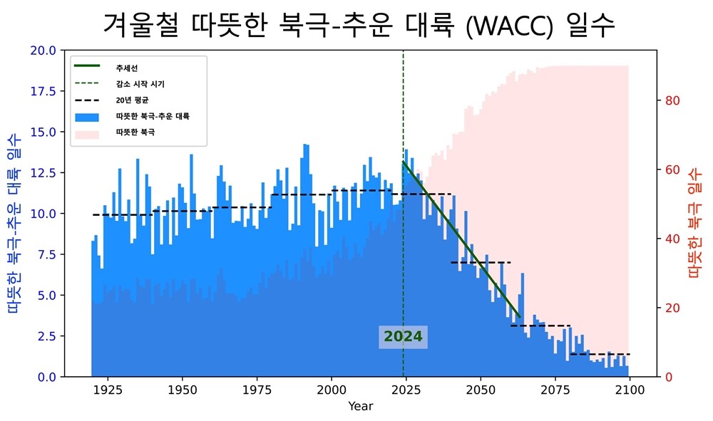 1920년부터 2100년까지 겨울철 따뜻한 북극-추운 대륙(WACC) 일수. ‘따뜻한 북극’ 및 ‘따뜻한 북극-추운 대륙’ 일수 빈도를 보여준다. ‘따뜻한 북극’은 바렌츠 카라해(30-70°E, 70-80°N), ‘추운 대륙’은 동아시아(80-130°E, 35-50°N) 지역을 의미한다. 왼쪽 및 오른쪽 축은 각각 ‘따뜻한 북극-추운 대륙’ 및 ‘따뜻한 북극’ 일수를 나타낸다. 녹색 선과 연도는 선형 추세와 감소 시작 연도를 보여준다. |
