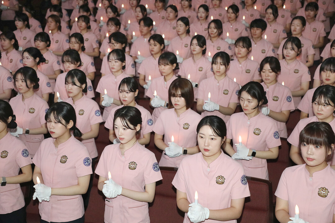 간호학과 학생들이 나이팅게일 선서를 하고 있다. 사진=영남이공대 제공 |