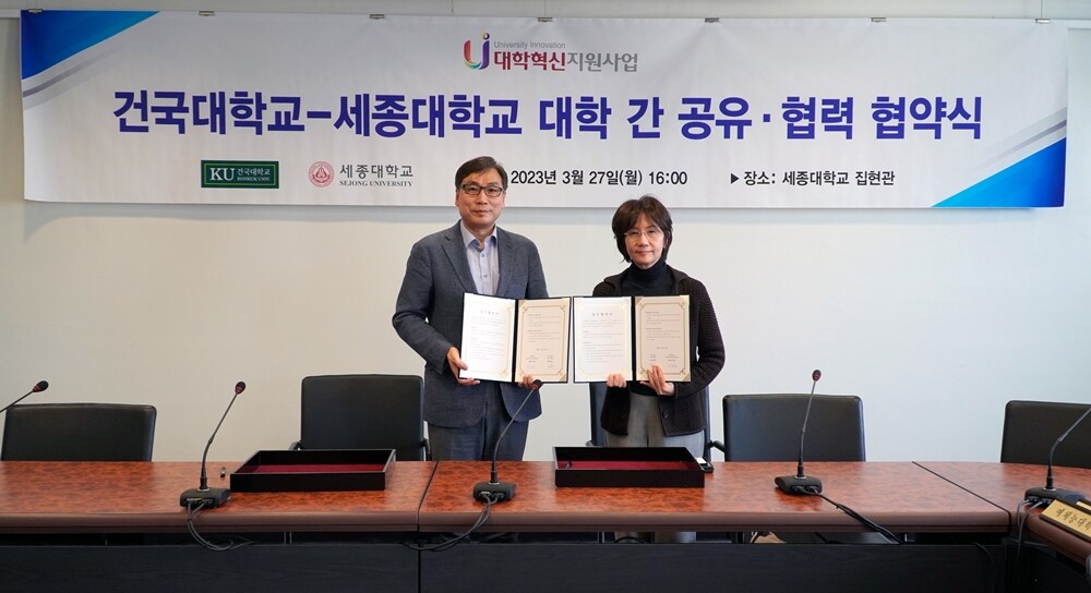 김희연(오른쪽) 세종대 대학혁신지원사업추진단장과 정환 건국대 혁신사업단장이 업무협약을 체결한 후 협약서를 들고 기념촬영하고 있다. 사진=세종대 제공 |