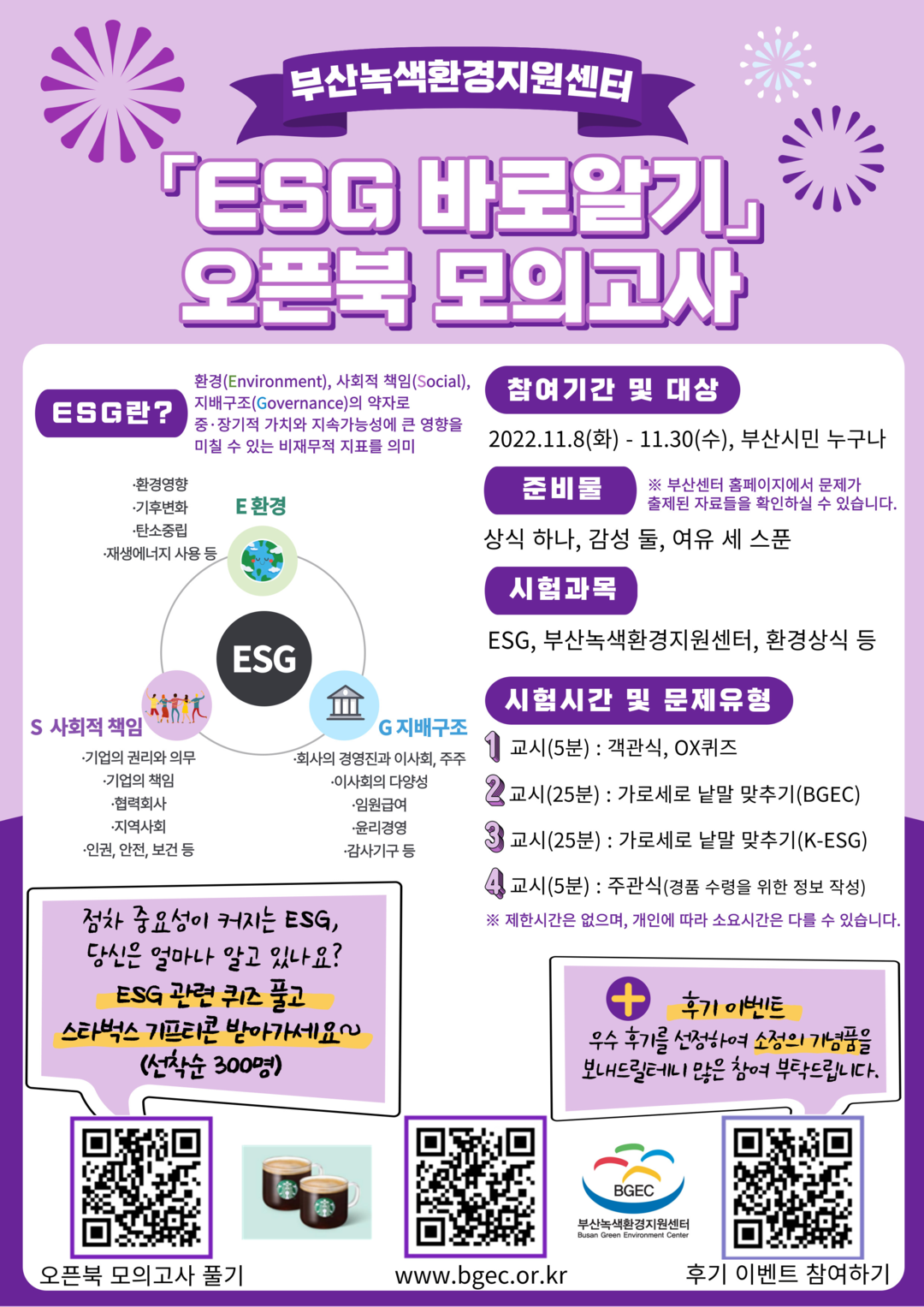 부경대학교 부산녹색환경지원센터가 8일부터 30일까지 부산시민을 대상으로 ‘ESG 바로알기 오픈북 모의고사’를 실시한다.