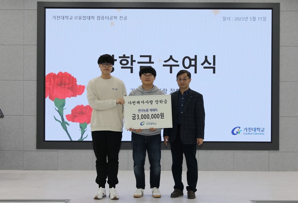제자사랑장학금 전달식이 학과별로 진행된 가운데 컴퓨터공학과 이병문 학과장(사진 오른쪽)이 15일 유관우(사진 왼쪽), 김석준 학생(가운데)에게 제자사랑장학금을 전달하고 기념사진을 찍고 있다. 사진=가천대 제공 |
