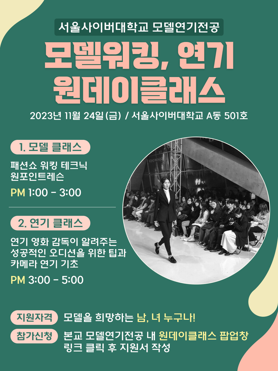 특강은 모델연기학과에 관심이 있는 서울사이버대 재학생과 일반인을 대상으로 진행되며, 신청은 SCU 모델연기학과 홈페이지에서 할 수 있다.