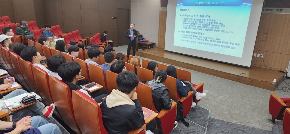 [대학저널 온종림 기자] 인천대학교 법학부가 12일 이진성 전 헌법재판소장을 초청해 특강을 진행했다. 이날 교수회관 3층 세미나실에서 열린 특강에는 법학부 재학생과 교직원 등 80여 명이 참석했다.