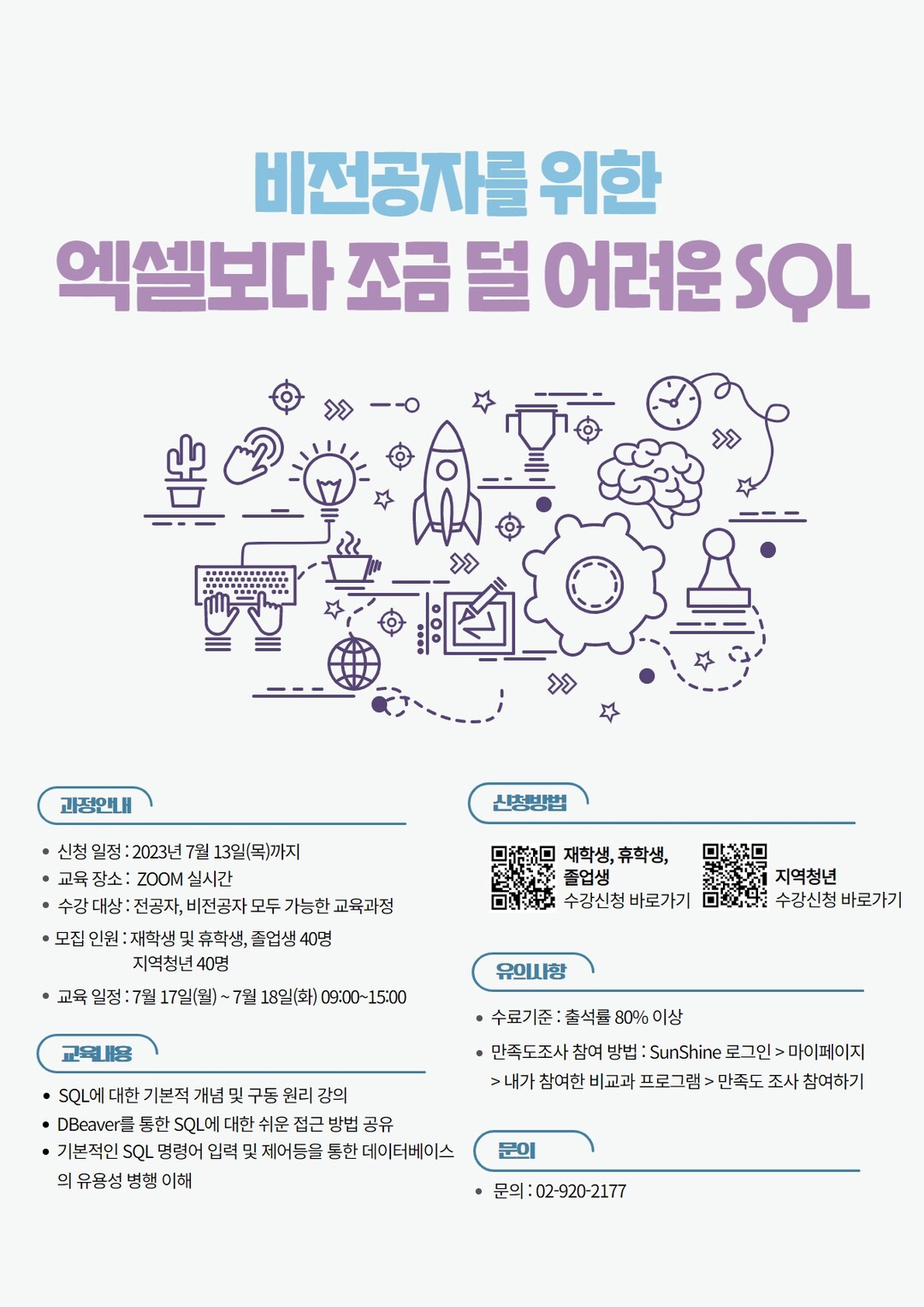 이번 교육 과정은 개발지식이 전혀 없는 비전공자를 위해 개발자들이 쓰는 어려운 SQL 문법이 아닌 실제 사무 및 행정 업무에서 쉽게 SQL을 활용해 데이터를 분석하기 위한 기본적인 문법들과 방법론을 다룬다.
