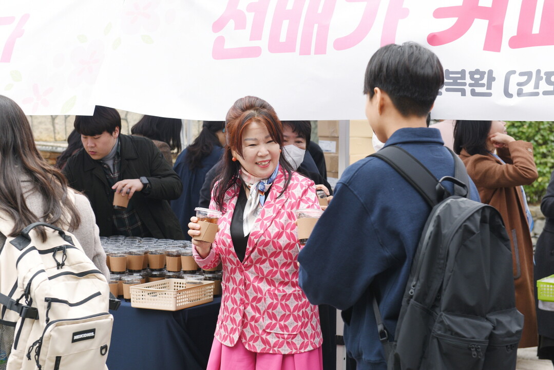 이번 행사는 간호학과 74학번 동문이자 간호대 동창회장인 안복환 동문이 커피 2,500잔과 도넛을 후원했다. 간호학과 1기 졸업생인 안 동문은 현재 팝콘소프트 더불라 대표를 맡고 있다.