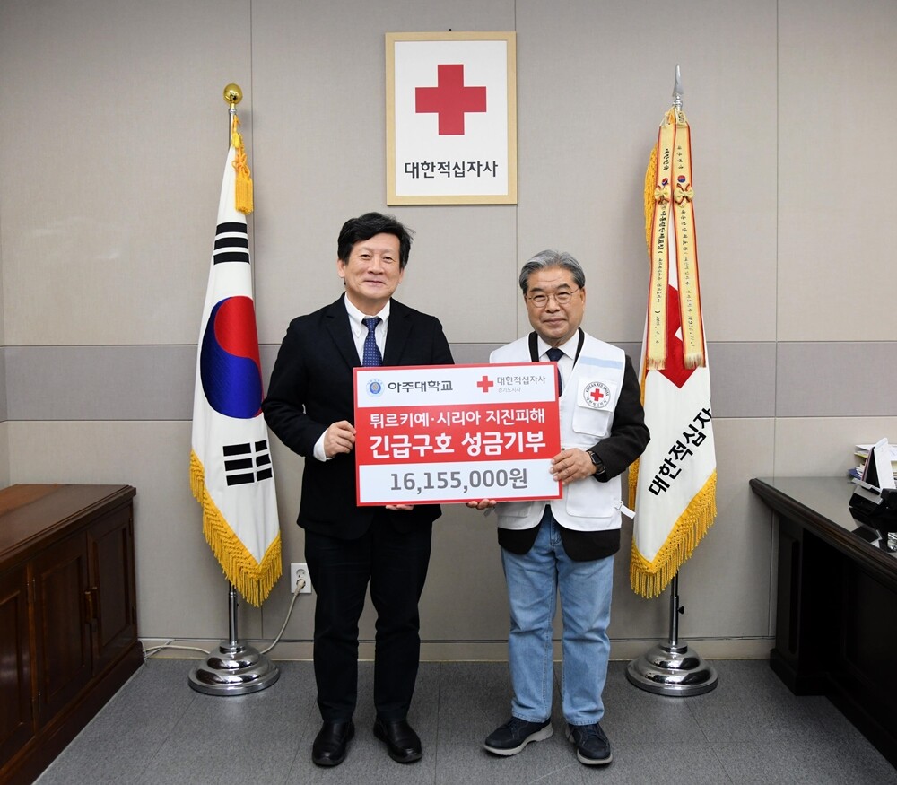 [대학저널 온종림 기자] 아주대학교 구성원들이 대지진으로 큰 피해를 입은 튀르키예와 시리아를 돕기 위해 모금한 성금 1615만 5000원을 지난달 28일 대한적십자사 경기도지사에 전달했다. 성금은 이재민을 위한 긴급 구호물품 전달과 현장 복구 지원 등에 사용될 예정이다.