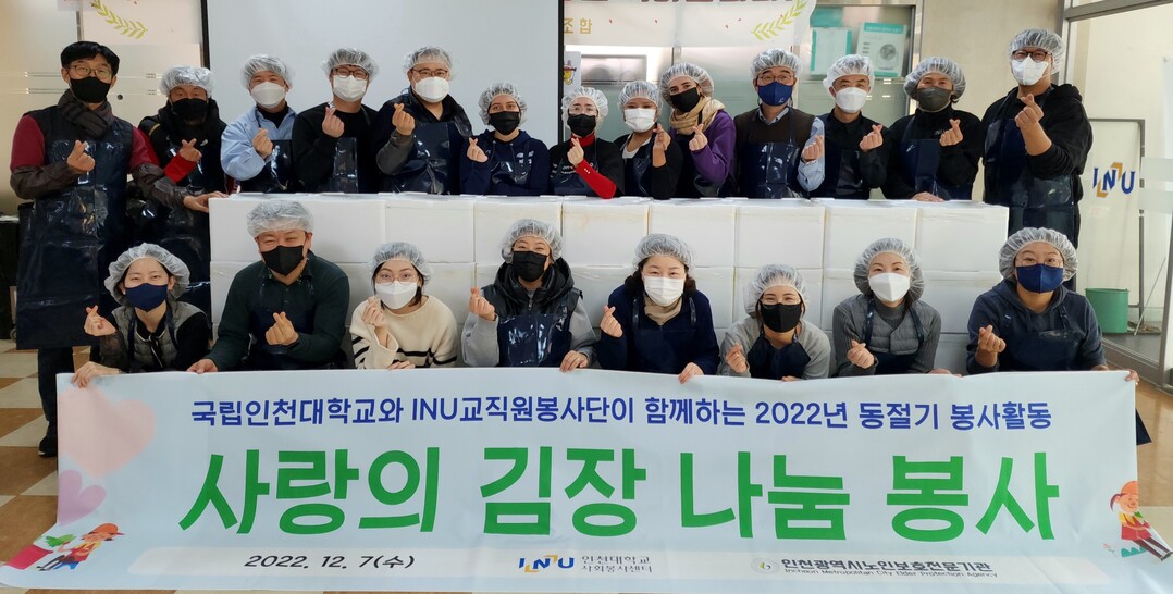 [대학저널 오혜민 기자]인천대학교는 교직원봉사단이 지난 7일 인천노인보호전문기관 학대피해노인 전용쉼터의 학대피해노인을 위한 ‘사랑의 김장나눔’ 행사를 통해 김치 50박스(500kg)를 전달했다고 8일 밝혔다.