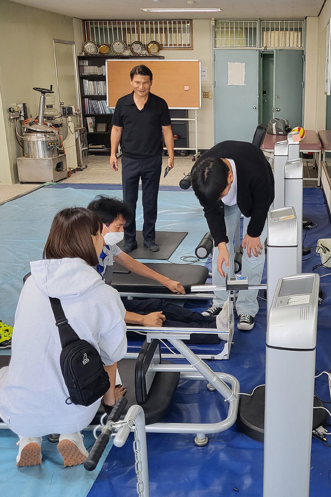 | 우석대 교수와 학생들이 학교 체육관에서 장애인에게 체육기구를 이용한 운동 방법을 알려주고 있다. 사진=우석대 제공 |
