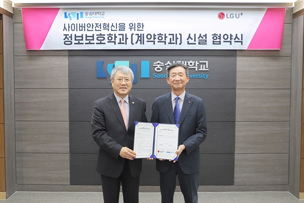 숭실대학교와 LG유플러스는 8일 숭실대 베어드홀에서 숭실대 장범식 총장, LG유플러스 황현식 대표이사 등이 참석한 가운데 정보보호학과 신설 및 운영을 위한 협약식을 가졌다.