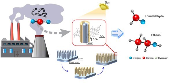 한국에너지공대 강영수 교수 연구팀이 이산화탄소를 에탄올로 고효율의 경제적이면서 선택적으로 전환할 수 있도록 환원전위를 조절하고, 적절한 BiVO4 광양극과 코어-쉘 구조의 ZnO@ZnTe를 기능화한 광음극을 개발했다. |