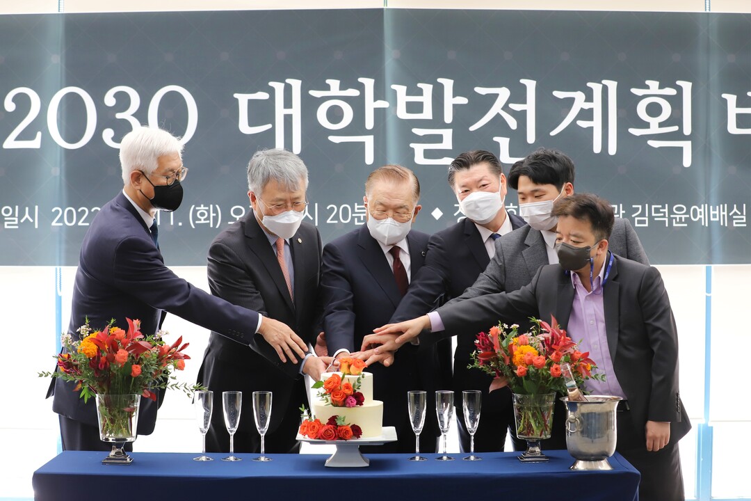 | 숭실대의 ‘숭실비전 2030 대학발전계획 비전선포식’에서 참석자들이 축하 케이크를 자르고 있다. 사진=숭실대 제공 |