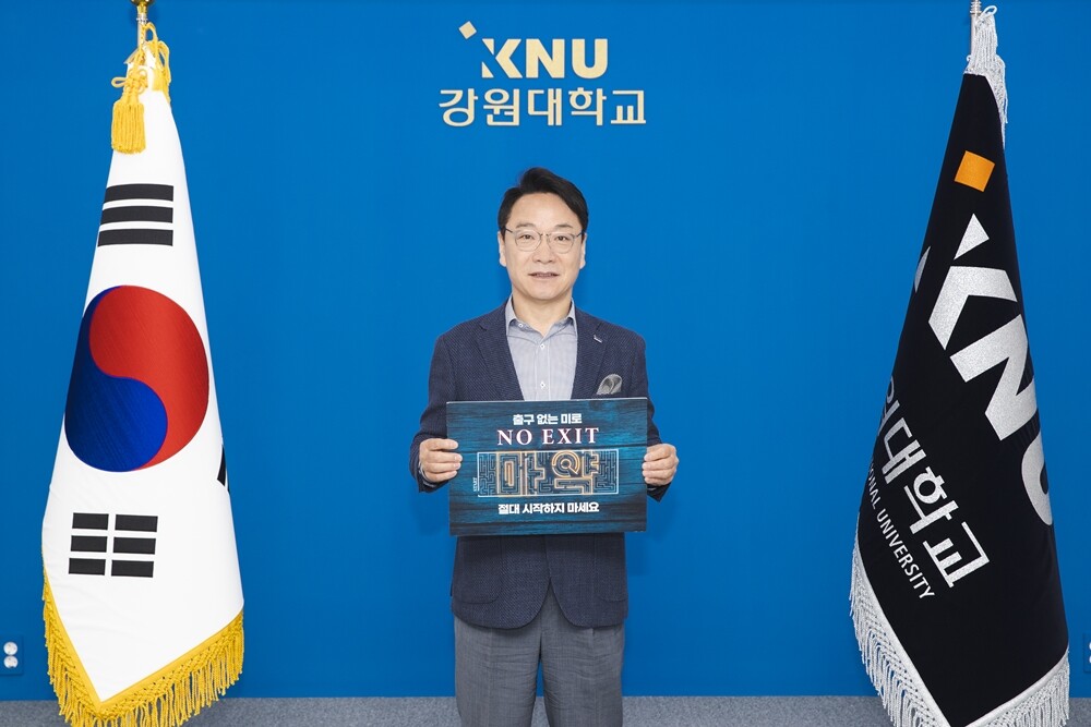 [대학저널 온종림 기자] 김헌영 강원대학교 총장이 지난 31일 마약 중독에 대한 경각심을 고취하고 마약범죄 예방을 위한 ‘NO EXIT’ 릴레이 캠페인에 동참했다.