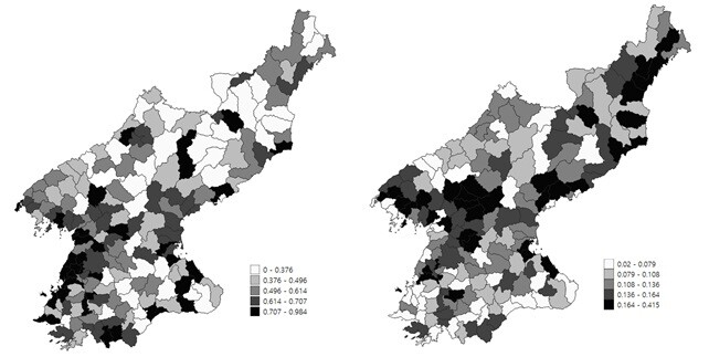 수출 제재(왼쪽), 수입 제재(오른쪽)에 따른 지역별 제재 취약도를 나타낸 북한 지도. KAIST 자료 |