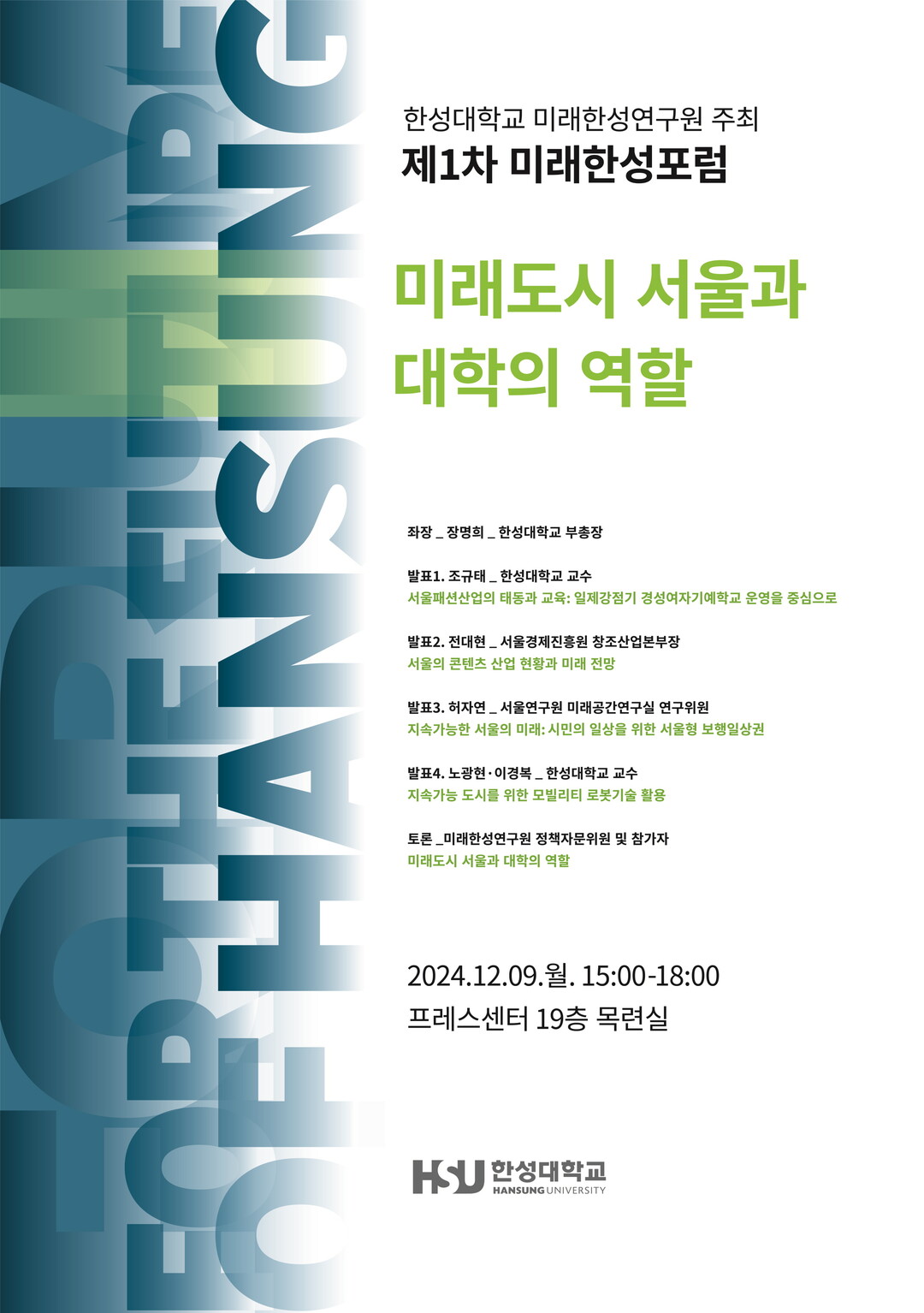 이번 포럼을 통해 한성대는 미래사회 변화에 대비하여 서울이 지속가능한 도시, 글로벌 Top 5 도시가 될 수 있는 방안 등에 대해 논의하고, 대학의 참여를 통해 해결할 수 있는 지역사회문제 발굴, 대학의 첨단기술(로봇, AI) 연구성과를 활용한 지역사회 기여 방안 등을 발굴할 것으로 기대하고 있다.