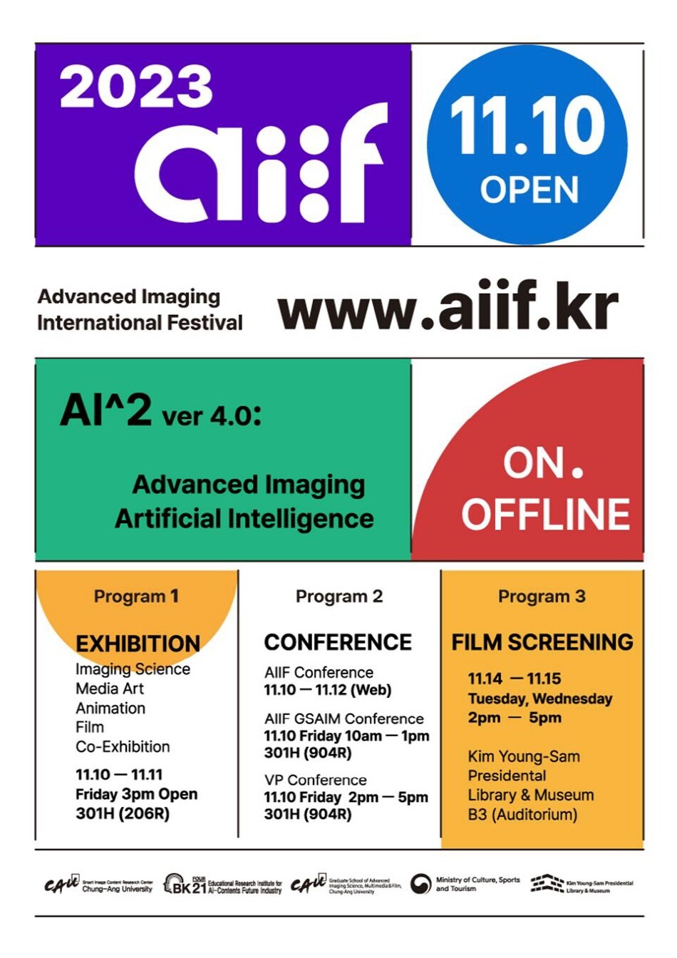 중앙대학교는 4단계 BK21 인공지능-콘텐츠 미래산업 교육연구단과 첨단영상대학원이 주관하는 ‘2023 AIIF(Advanced Imaging International Festival) 첨단영상 국제 페스티벌’을 10일 온라인과 오프라인을 통해 동시 개막한다.