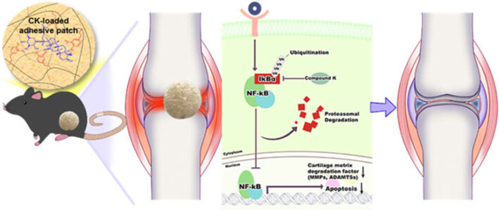 Compound-K가 결합된 패치에서 방출된 Compound-K는 염증반응의 주된 경로 중 하나인 핵인자 카파비(NF-kB) 경로를 억제함으로써 염증성 사이토카인으로 인해 발현이 증가하는 연골기질 분해와 세포사멸 및 연골 파괴를 억제하고, 연골재생에 효과적인 것으로 나타났다.