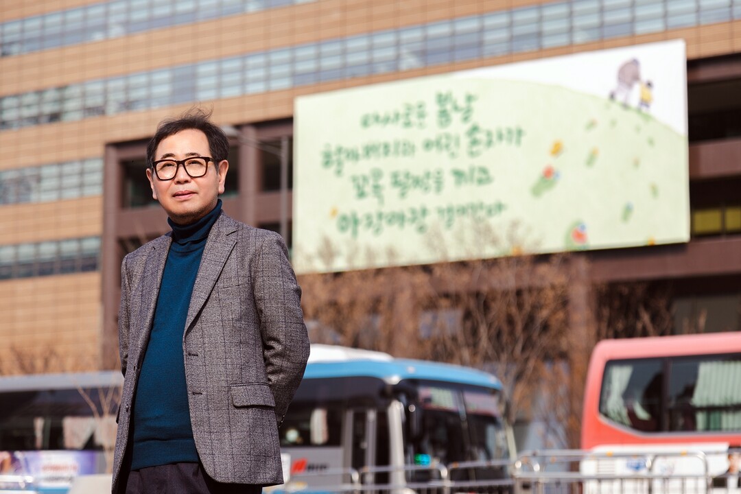 | 2023 광화문 글판 봄편에 선정된 목포대학교 국문학과 김선태 교수가 기념촬영을 하고 있다. 사진=목포대 제공 |