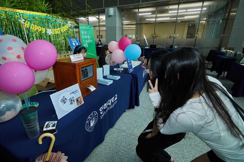 정석학술정보관 개관 20주년 기념행사에 마련된 포토존에서 학생들이 사진을 찍고 있다. 사진=인하대 제공 |
