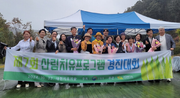 지난 22일 대전 치유의 숲에서 제7회 '산림치유프로그램' 경진대회가 열린 가운데 참가자들이 기념사진을 찍고 있다. 사진=산림청 제공 |