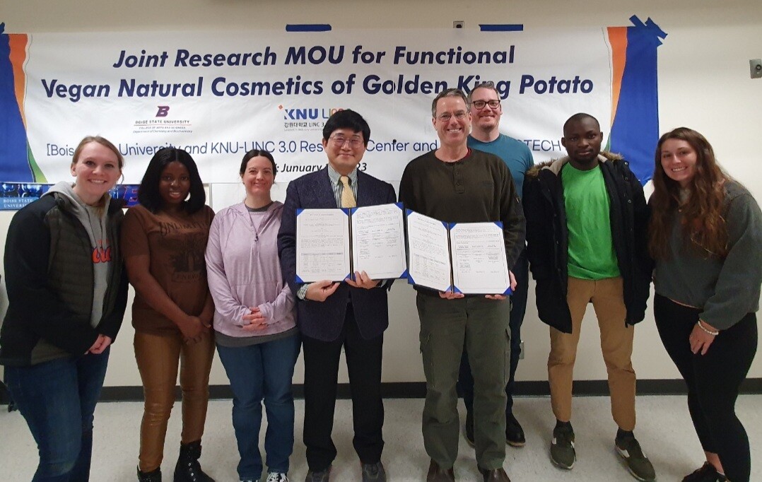 [대학저널 온종림 기자] 강원대학교는 LINC3.0사업단과 의생명과학대학이 미국 보이시 주립대학교및 세바바이오텍과 지난 17일 보이시 주립대에서 ‘골든킹 감자 우유를 이용한 해외 수출용 천연 비건 화장품 연구 개발’을 위한 상생 산학협력 발전체계 구축 업무협약을 체결했다고 18일 밝혔다.