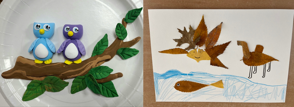 늘봄학교 프로그램(클레이아트와 색종이 접기, 낙엽을 활용한 예술놀이 프로그램)을 통해 완성한 초등학교 1학년 학생들의 작품. 사진=건양대 제공 |