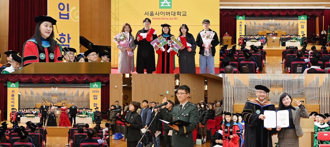 서울사이버대 2026년 입학식 현장 (왼쪽 위부터 시계방향으로) 이은주 총장이 입학생들에게 환영사하고 있다 / 포토월에서 이은주 총장과 올해의 입학생들이 기념사진을 찍는 모습 / 차이콥스키홀에서 진행한 서울사이버대 2026년 입학식 / 이상균 이사장이 올해의 입학생과 기념사진을 찍는 모습 / 서울사이버대 2026년 입학생 대표의 선서 / 서울사이버대 성악과 교수진이 입학생들을 향해 축가를 부르고 있다. |