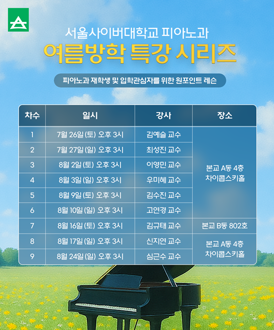 [대학저널 온종림 기자] 서울사이버대학교 피아노과가 2025년 여름방학을 맞아 ‘피아노과 재학생 및 입학관심자를 위한 원포인트 레슨’ 특강시리즈를 진행한다.