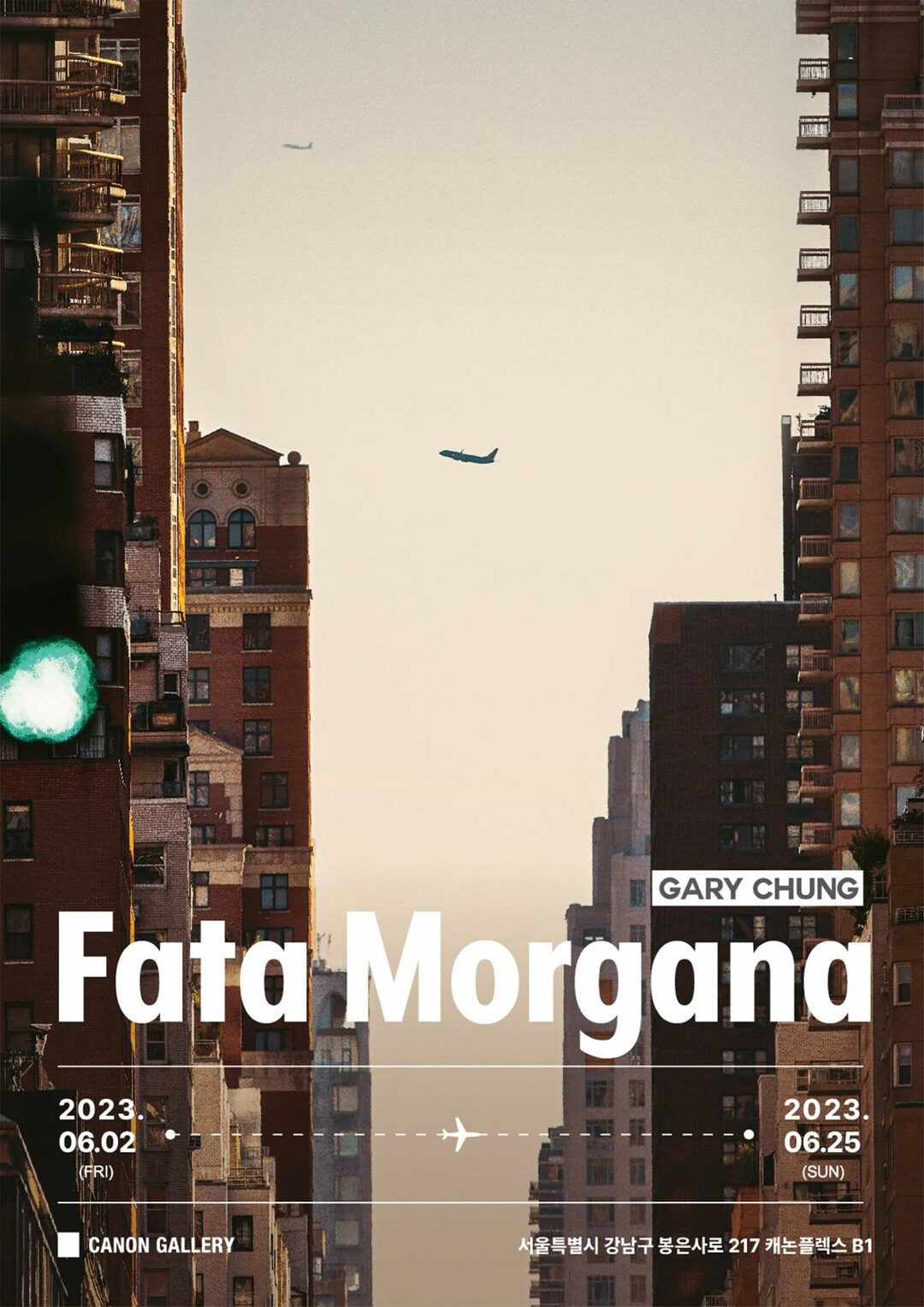 FATA MORGANA전은 항공기의 GPS를 파악해 공간과 조화를 이루는 사진 작업을 하는 개리정 작가가 올해 미국 서부 캘리포니아 일대를 모터사이클로 일주하며 담은 항공기 사진과 뉴욕 맨해튼에서 새로 출시된 Canon RF 100-300mm F2.8 렌즈와 함께 대도시와 조화를 이루는 항공기 사진 40여 점과 미디어 파사드로 선보이는 100여점의 항공기 사진을 선보일 예정이다.