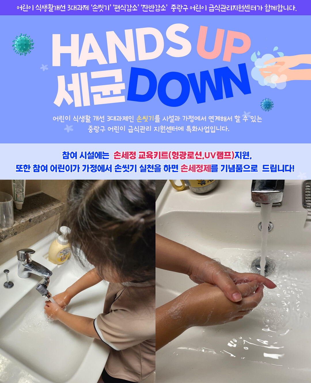 어린이 식생활 식습관 개선 사업의 일환으로 기획된 이번 특화사업을 통해 센터는 ‘손 씻기의 중요성과 올바른 손 씻기 방법’을 교육할 수 있도록 대상 연령의 눈높이에 맞는 교육 영상을 제작하여 손 씻기 교육키트와 함께 어린이 시설에 제공했다. 또한 교육을 받은 어린이들의 가정에서도 손 씻기 실천 활동을 인증하면 손세정제를 참여 기념품으로 제공하여 가정까지 연계한 식습관 교육이 이루어질 수 있도록 진행했다.