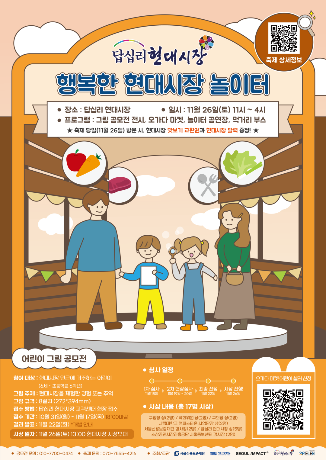 또한 답십리 지역의 유아⋅초등학생 그림 공모전 전시와 가족과 어린이가 함께 하는 오가다 마켓, 대학 중심의 창업동아리·보육기업 부스, 소상공인을 대상으로 한 판매부스 등 답십리 현대시장 상가대표와 주민이 참여하는 놀이무대로 구성된다.