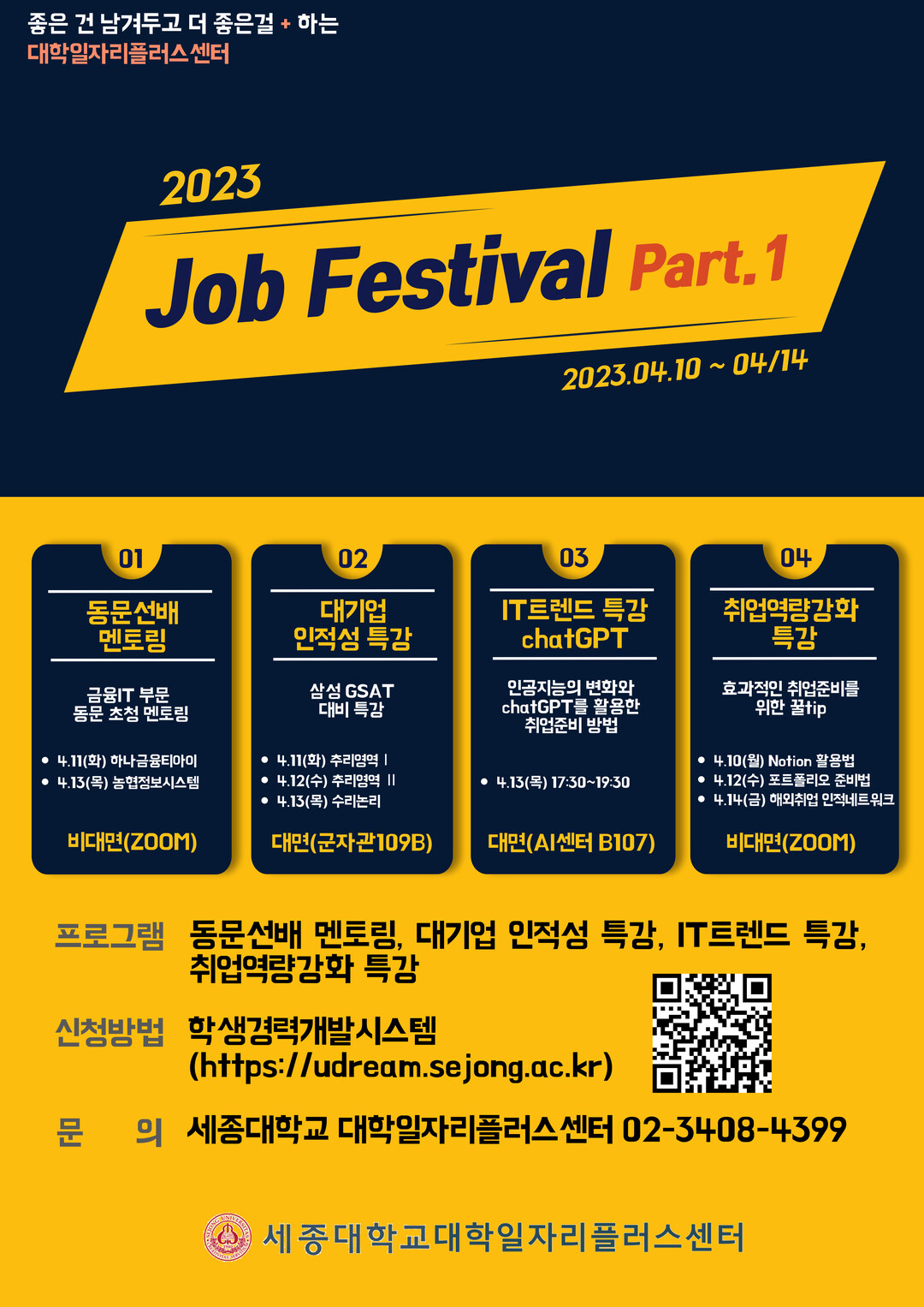 참가 신청은 세종대 학생경력개발시스템 홈페이지에서 가능하며, 보다 자세한 내용은 대학일자리플러스센터로 문의하면 된다.