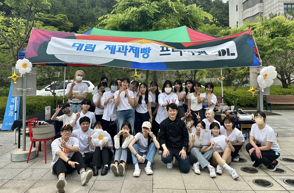 대림대학교 제과제빵과 학생들이 ‘제1회 대림대학교 제과제빵 프리마켓’을 지난 6월 첫째 성공리에 마친 뒤 기념촬영하고 있다. 사진=대림대 제공 |