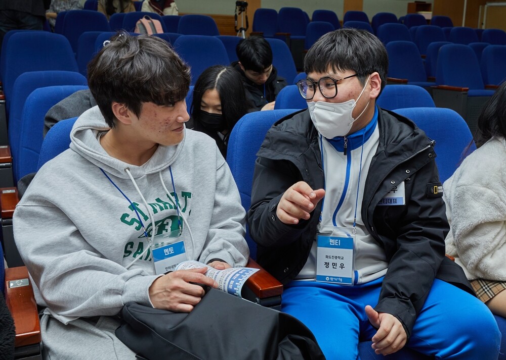 지난 15일 열린 복나눔 멘토링 프로그램 발대식에서 만난 인하대학교 재학생 멘토 학생(왼쪽)과 청소년 멘티 학생이 대화를 나누고 있다. 사진=인하대 제공 |