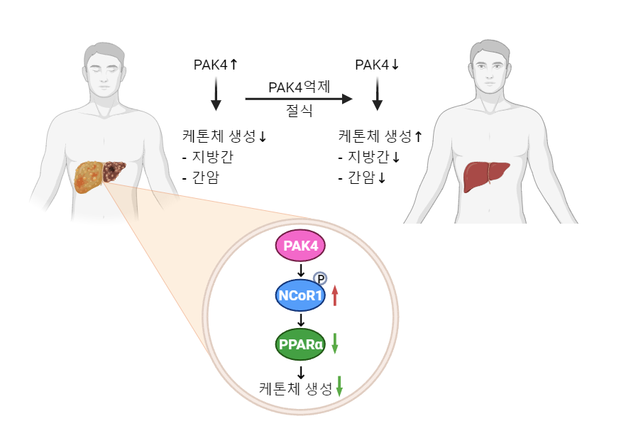연구팀은 PAK4의 새로운 인산화 기질로서 NCoR1 단백질을 찾았고, PAK4에 의해 NCoR1 단백질이 인산화되면 지방산 산화에 핵심적인 전사인자 PPARα의 활성화를 억제해 케톤체 생성을 낮추는 것으로 나타났다.