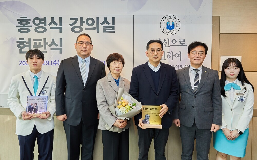 인하대는 지난 29일 5호관에서 ‘홍영식 강의실’ 현판식을 열었다. 현판식에는 조명우 총장과 김웅희 대외부총장과 홍영식 동문의 아내 이종옥씨, 장남 홍동표씨, 차남 홍정표씨 등이 참석했다.