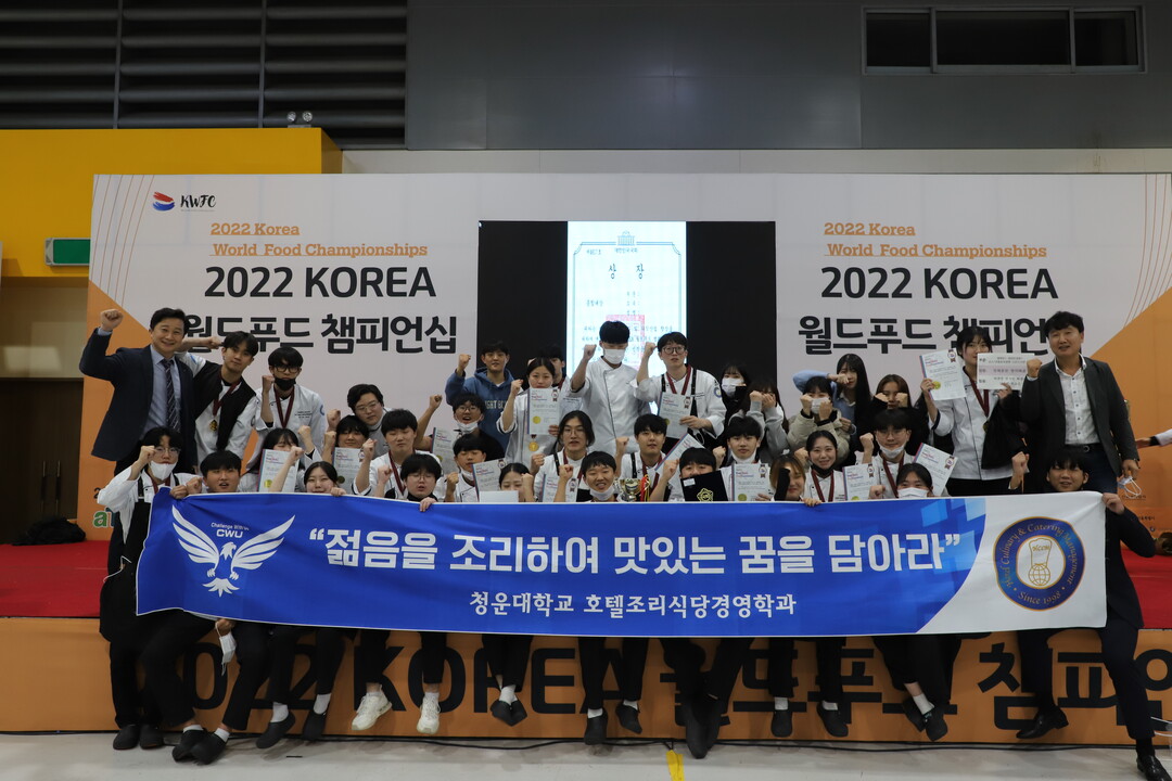 31일 청운대에 따르면 이 대학 호텔조리식당경영학과 학생들은 지난 28~30일 열린 '2022 KOREA 월드푸드 챔피언십'에 11개팀 54명이 출전해 대상(해양수산부장관상)과 다수의 메달을 수확했다.