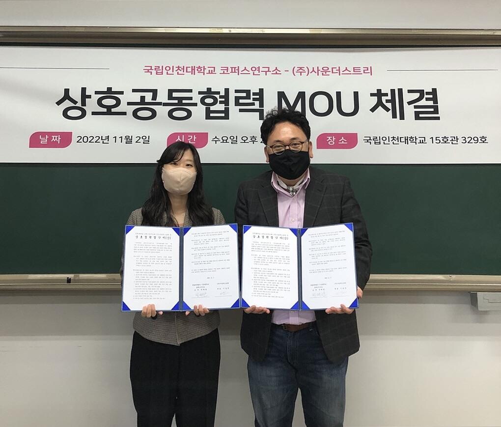 | 이윤경(왼쪽) 사운더스트리 대표와 정채관 인천대 코퍼스연구소장이 업무협약을 체결한 뒤 협약서를 펼쳐보이고 있다. 사진=인처대 제공 |
