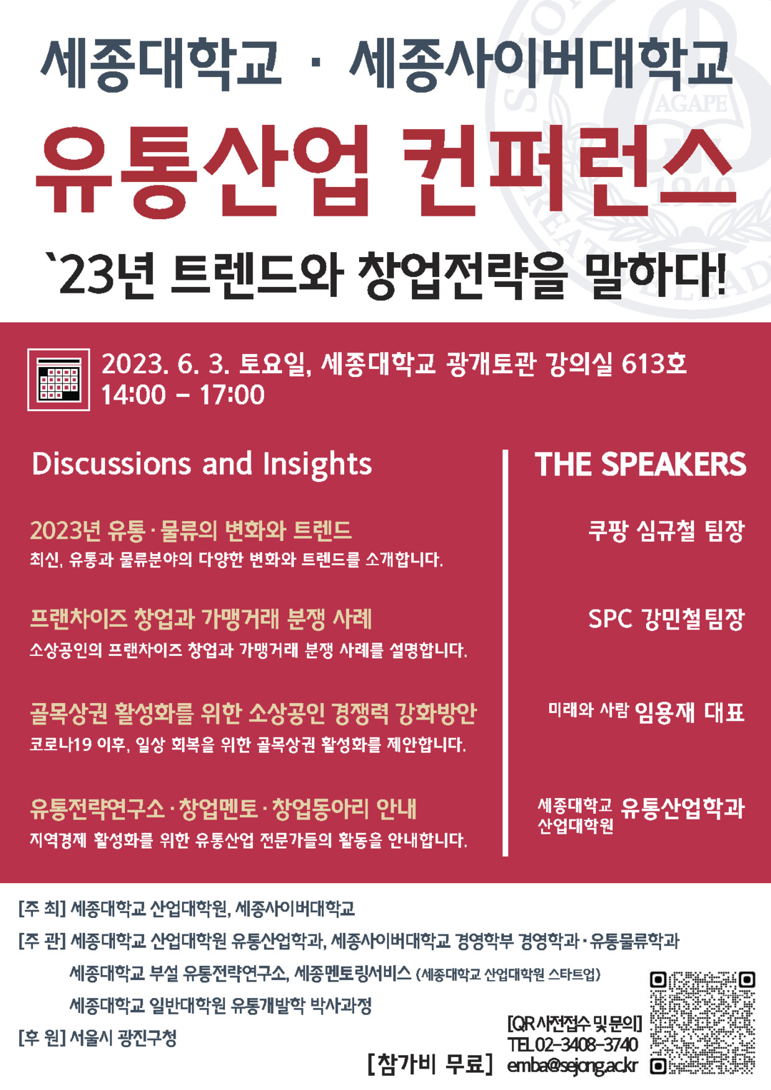 컨퍼런스를 기획한 박노현 세종대 산업대학원 주임교수와 백소라 세종사이버대 유통물류학과 학과장은 “유통물류의 변화뿐만 아니라 지역경제 활성화를 위한 소상공인 경쟁력 강화방안 등에 쿠팡, SPC 등에 재직 중인 재학생들이 발표하는 의미있는 시간이 될 것”이라고 설명했다.