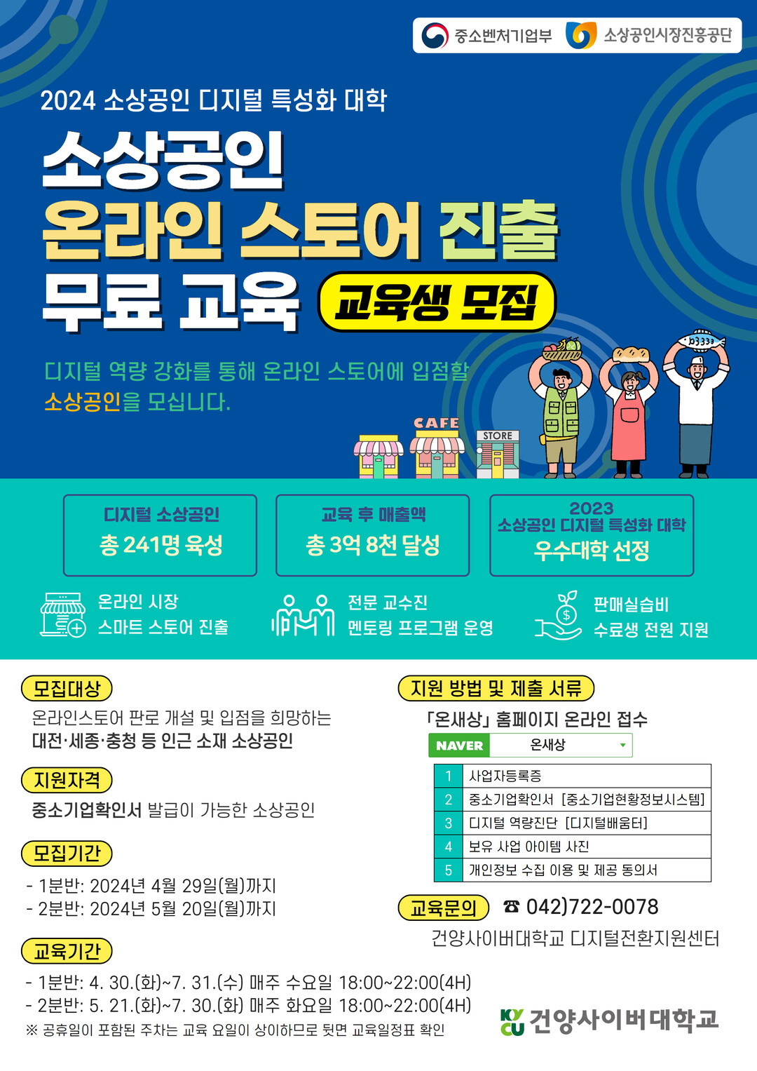 모집 규모는 디지털 특성화 대학 120명, 디지털 취약 소상공인 1:1 코칭 40명 등 총 160명을 29일까지 모집한다. 이번 교육은 전액 무료로 진행되며 대전.충청.세종권 소상공인 및 예비 창업자를 대상으로 4월 30일부터 시작해 7월 31일까지 2개 분반으로 약 3개월간 진행된다.
