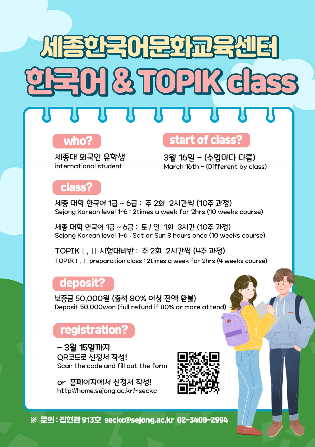 외국인 유학생을 대상으로 진행되는 이번 프로그램은 ▲세종 대학 한국어 1급~6급 평일반과 주말반 ▲TOPIK 시험대비반이다. 수업 요일과 시간은 반별로 다르다. 학부생과 대학원생, 교원 등 세종대 구성원이라면 누구나 수강 가능하다. 신청은 포스터 속 QR코드나 홈페이지에서 가능하다. 자세한 내용은 세종한국어문화교육센터로 문의하면 된다.