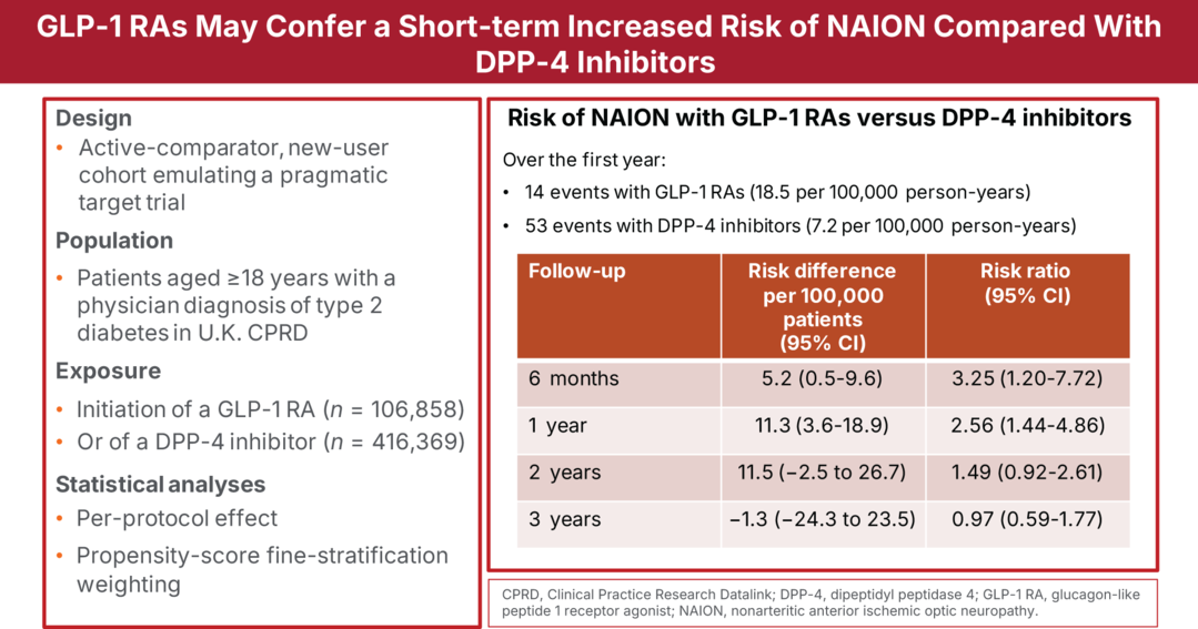 연구팀은 GLP-1 계열 치료제를 처음 처방받은 약 10만 6천 명과, 다른 당뇨병 치료제(DPP-4 억제제)를 처음 처방받은 약 41만 6천 명을 비교했다. 그 결과, 치료 시작 후 1년 이내 NAION 발생 위험은 GLP-1 치료제 사용군에서 비교군 대비 약 2.6배 높았다(위험비 2.56, 95% 신뢰구간 1.44-4.86).