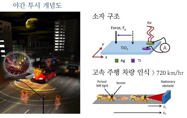 개발된 센서는 적외선(365nm)부터 중적외선(1720nm)까지 광대역의 광검출이 가능하다. 더불어 자가전력으로 동작하여 별도의 전원이 필요 없고, 초당 천만 비트 이상 수준의 초고속 감지가 가능하다. 아주대 연구팀은 새로운 소자를 이용, 야간에서 720km/hr의 속도로 이동하는 물체를 근적외선 감지 방식으로 식별할 수 있음을 개념 실험을 통해 증명했다.