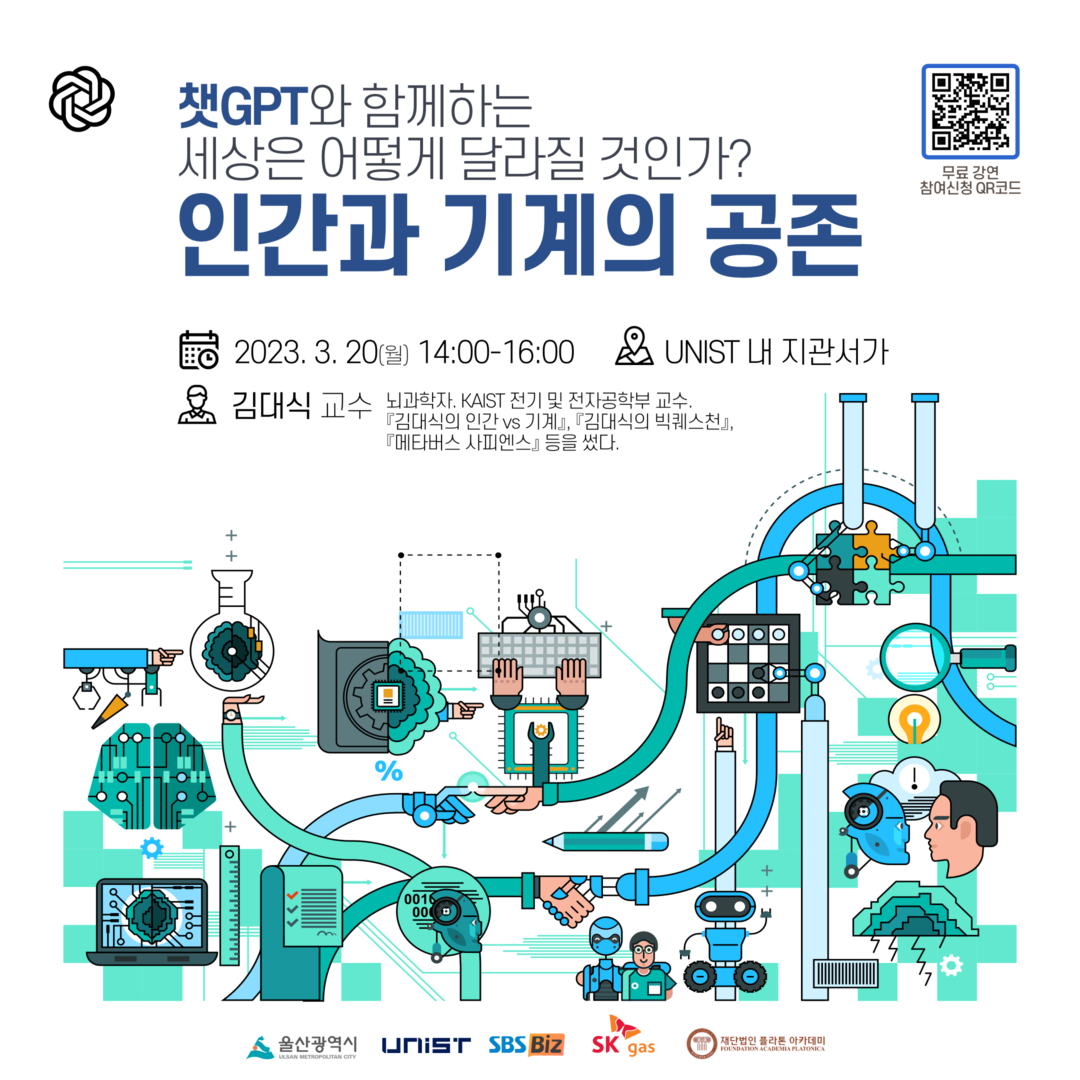 16일 UNIST에 따르면 강연에는 김대식 KAIST(한국과학기술원) 전기 및 전자공학부 교수가 초청돼 최근 발간된 자신의 저서 ‘챗GPT에게 묻는 인류의 미래’를 중심으로 인간과 기계의 공존 가능성과 미래상에 대해 설명한다.