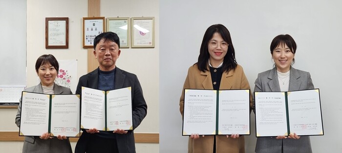 배나래 사회복지학과장이 김현성 남원시니어클럽 관장(왼쪽)과 김경옥 전주서원시니어클럽 관장과 협약을 마치고 기념촬영하고 있다. 사진=건양사이버대 제공 |