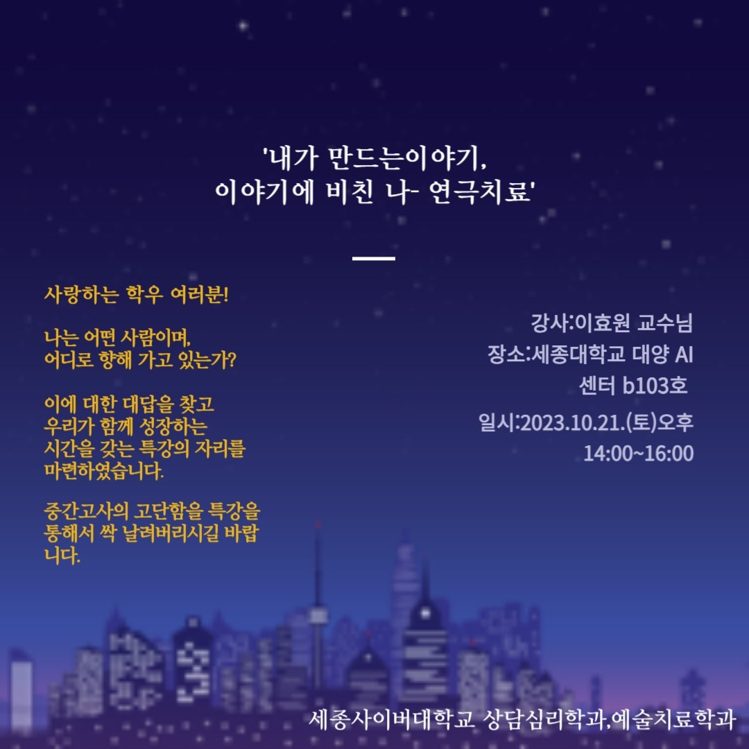 지난 10월 21일에 진행된 특강은 ‘내가 만드는 이야기, 이야기에 비친 나-연극치료’라는 주제로 삶의 무대에서 느끼는 다양한 감정과 더불어 자신의 정체성을 점검해보고 성숙한 상담 전문가로서 성장하는 시간을 가졌다.