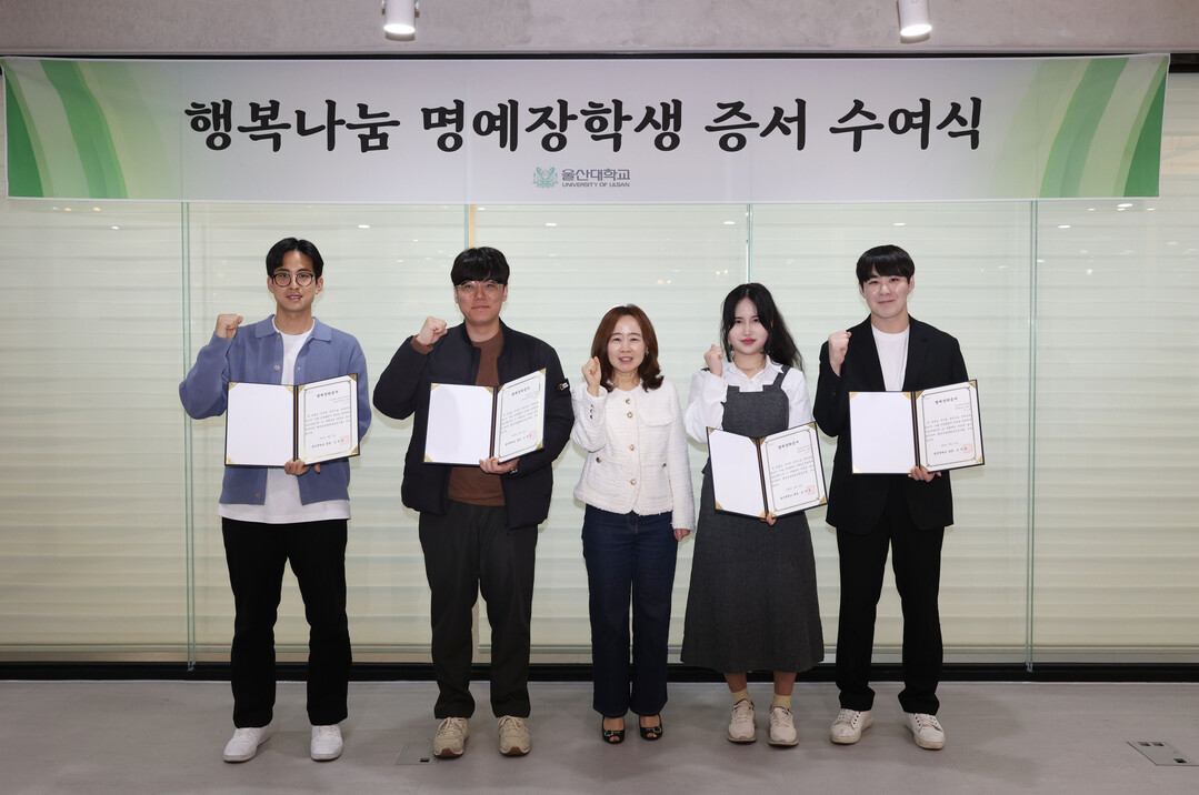 울산대학교는 최근 행복나눔 명예장학생 증서 수여식을 열었다고 20일 밝혔다.